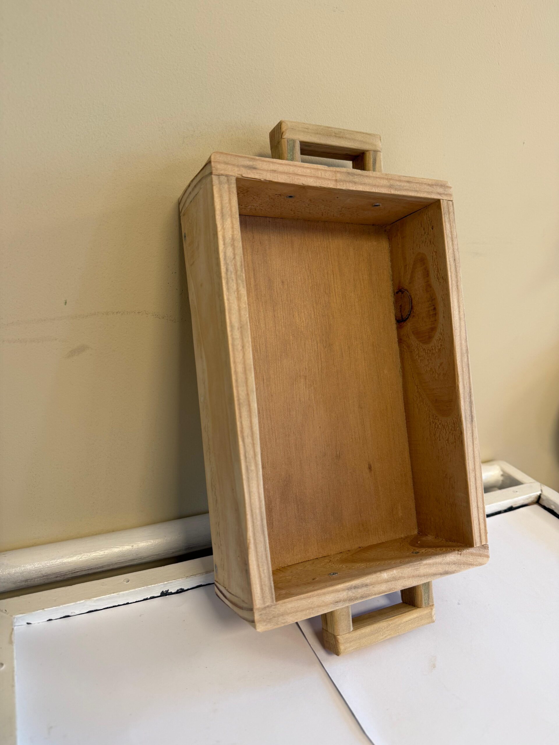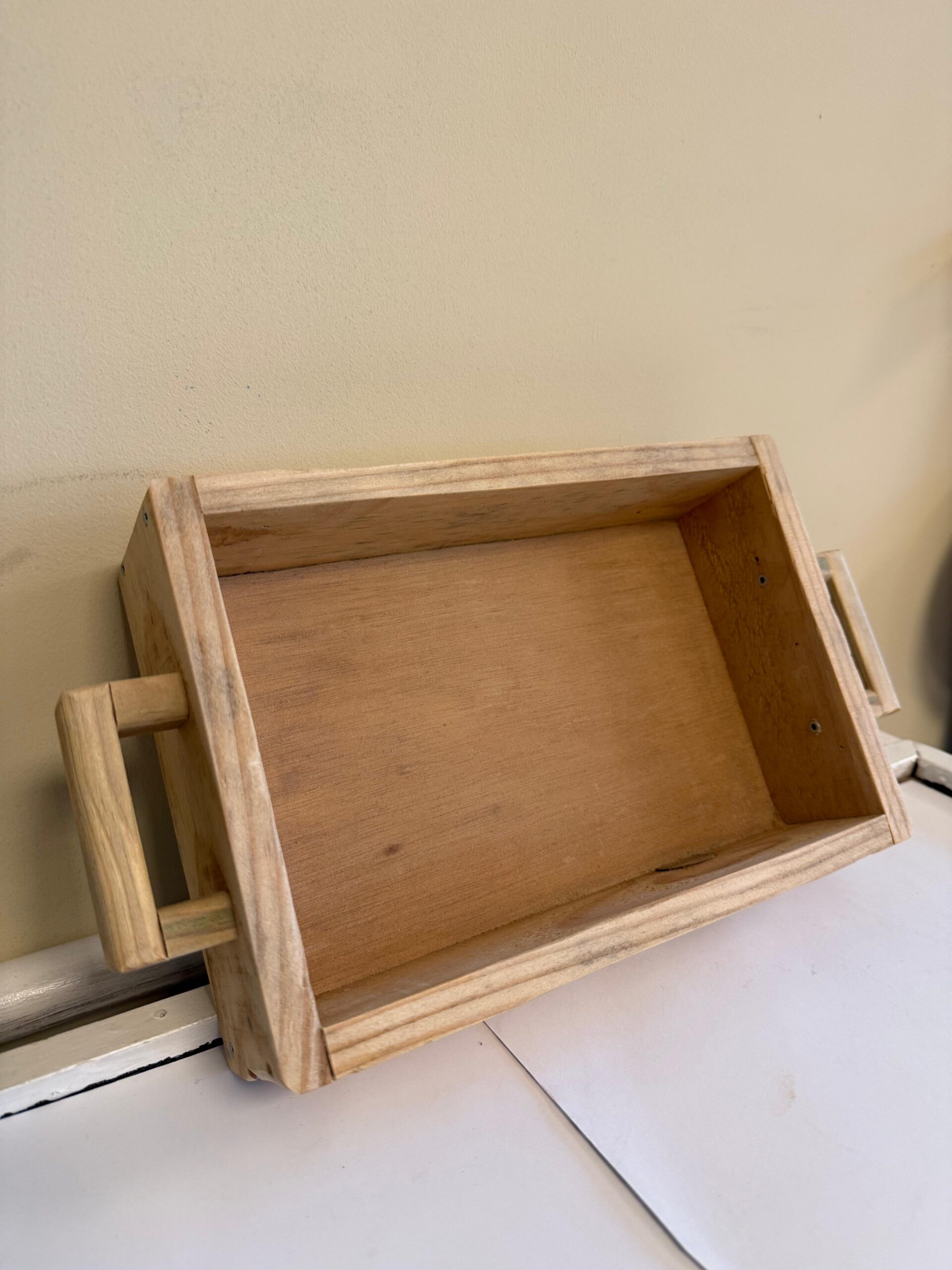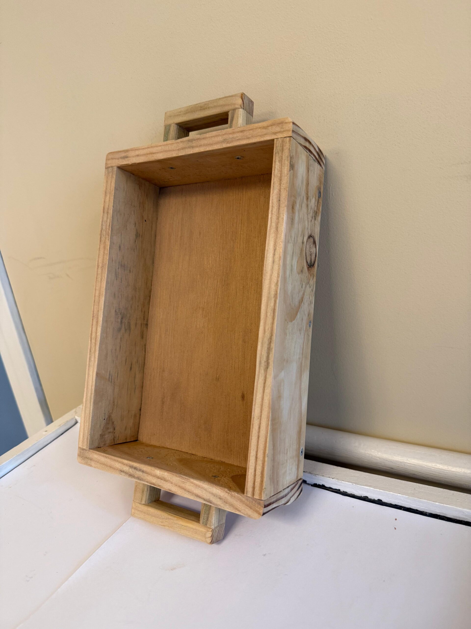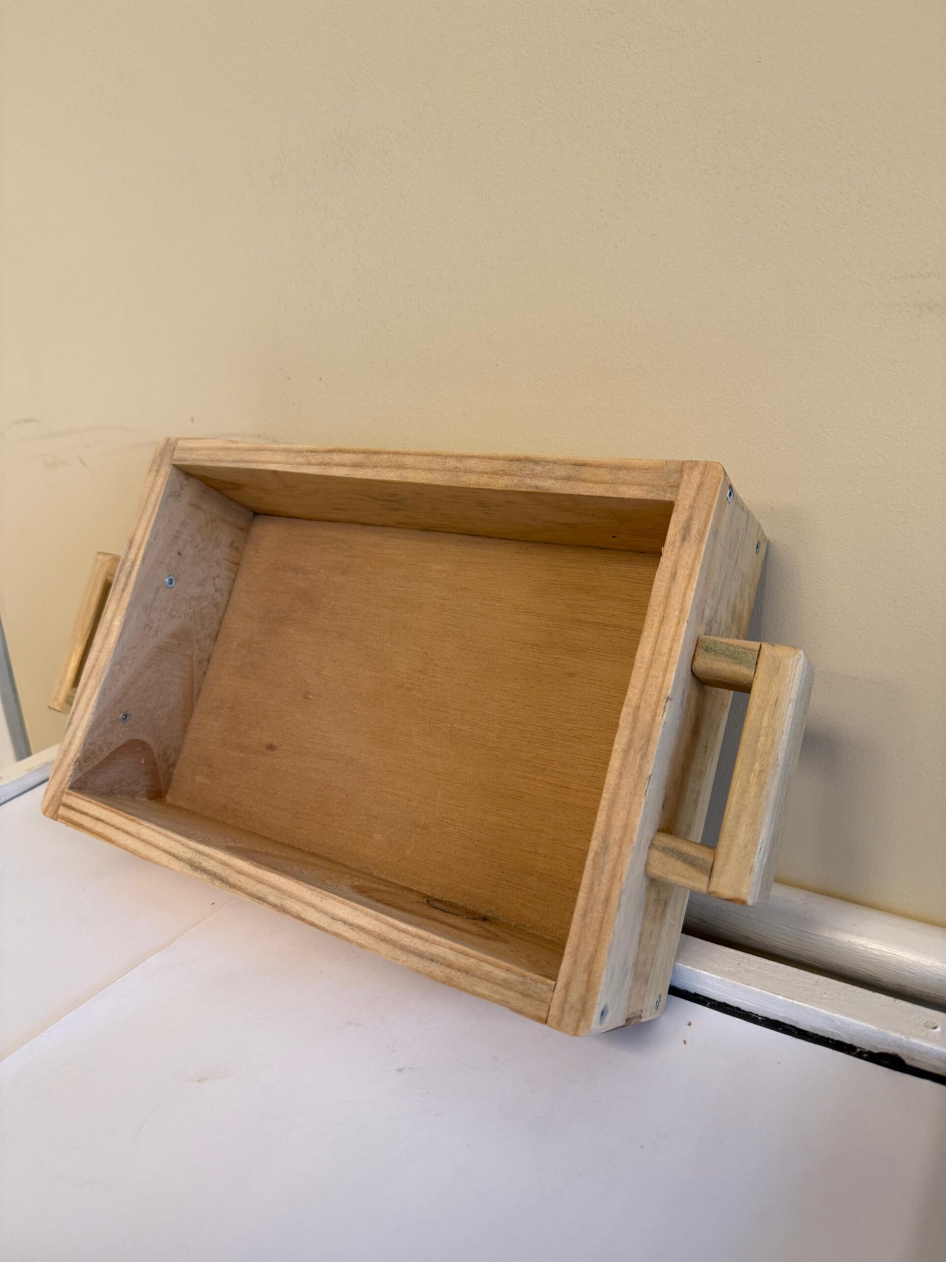 Materiaal hout, gemaakt door 1 deelnemer. Afmetingen: b=18cm, l=33cm, d=7cm